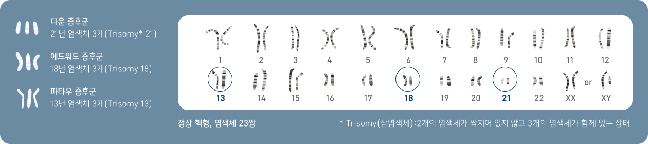 산전 주요 염색체 질환인 다운 증후군(Down Syndrome), 에드워드 증후군(Edward Syndrome), 파타우 증후군(Patau Syndrome) 등 염색체의 수적 이상 및 구조적
